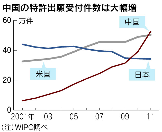 世界知的所有権機関(WIPO)が11日発表した2011年の国別の特許出願受付件数で、中国が米国を抜いて初めて首位に立った。